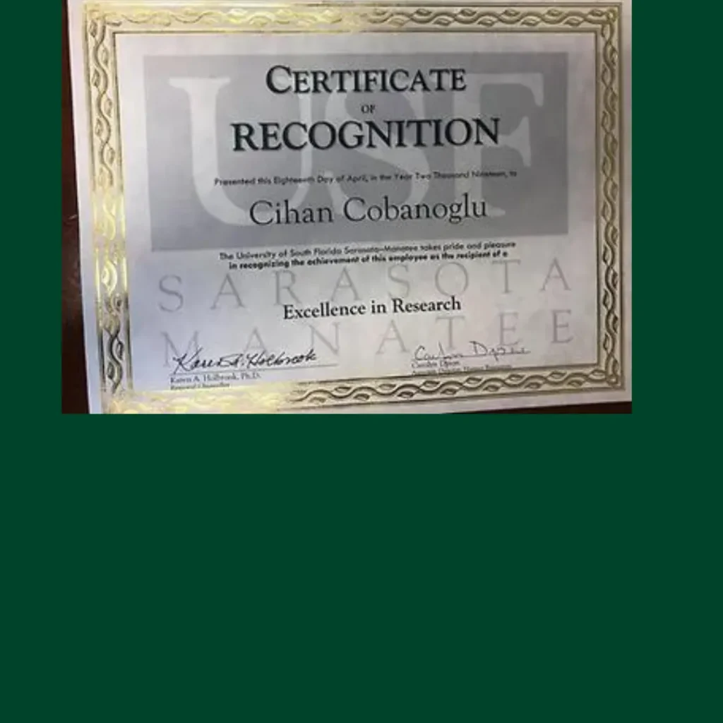 Prof Cobanoglu received “Excellence in Research” award from University of South Florida Sarasota-Manatee for 2018-2019 academic year. Each year, one faculty (tenured category) is selected as the recipient of this prestigious award. The award is selected by peers. He has received this award once more in 2016.